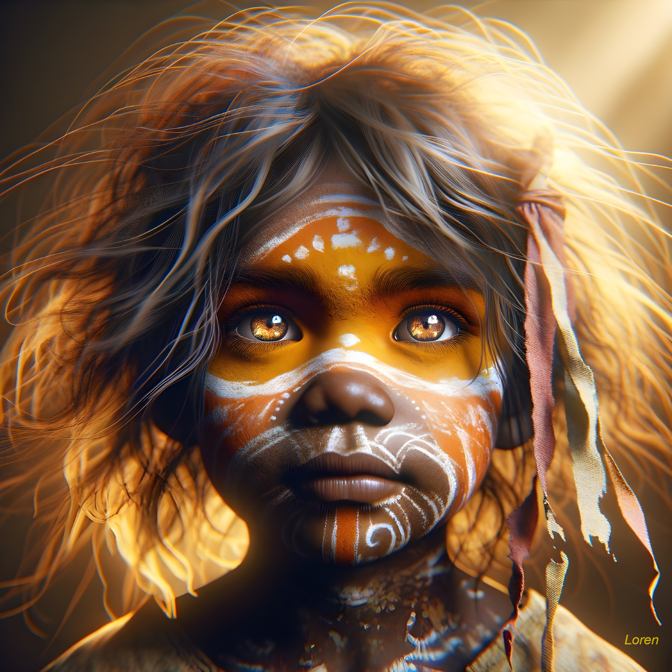 A close-up of a child with striking eyes and traditional face paint, possibly indigenous, with an intense gaze.