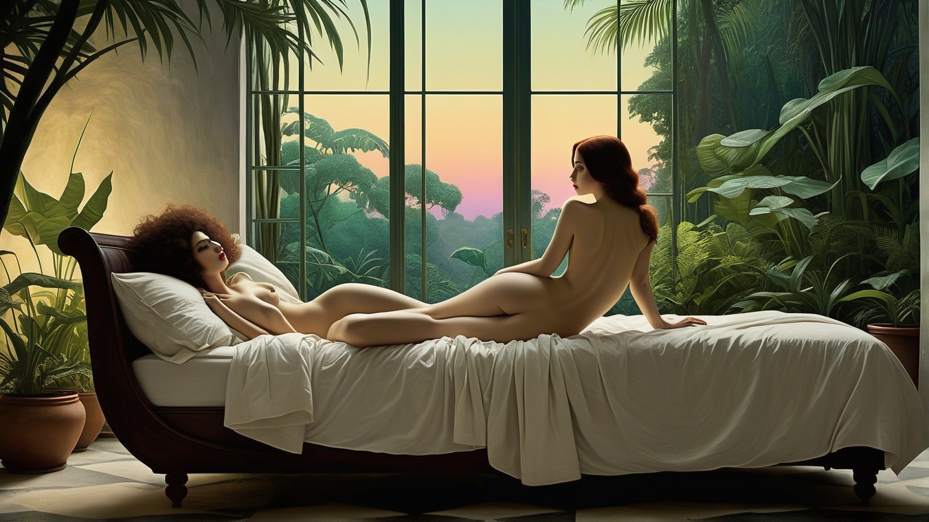A serene scene depicts a nude figure reclining on a bed, gazing out of large windows into a vibrant jungle at sunset, surrounded by lush greenery and colorful flowers.