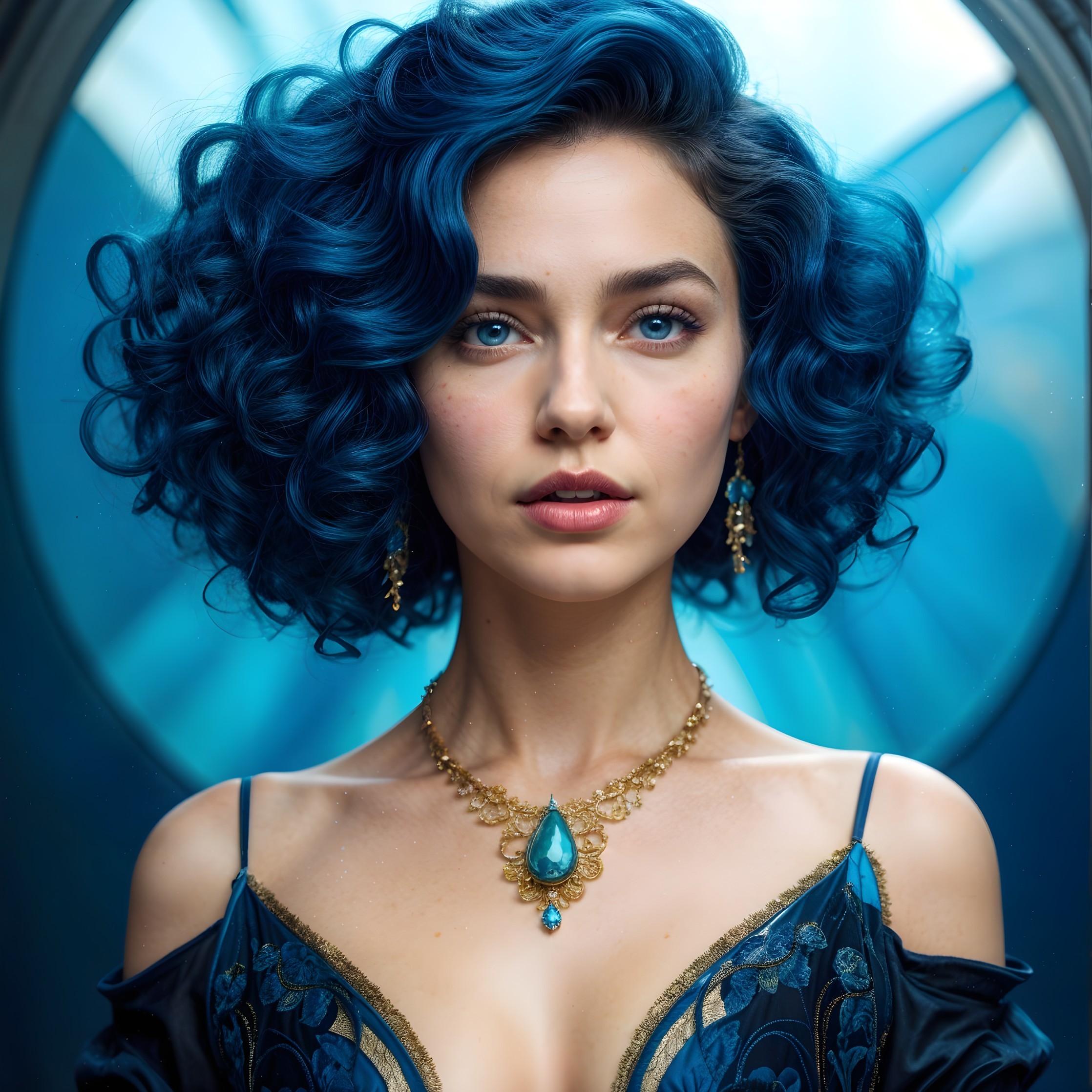 A young woman with vibrant blue curls gazes intently, adorned in an elegant dark dress and gold jewelry. The background features soft, ethereal lighting that enhances her striking features.