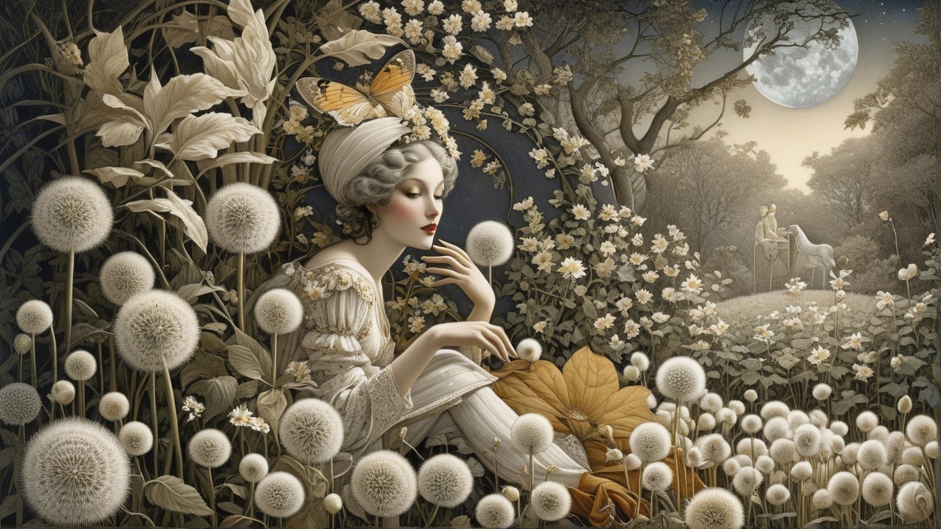 A serene woman in a delicate dress interacts with foxes among large white flowers, set against a moonlit landscape. The gentle ambiance exudes a sense of peace and harmony with nature.