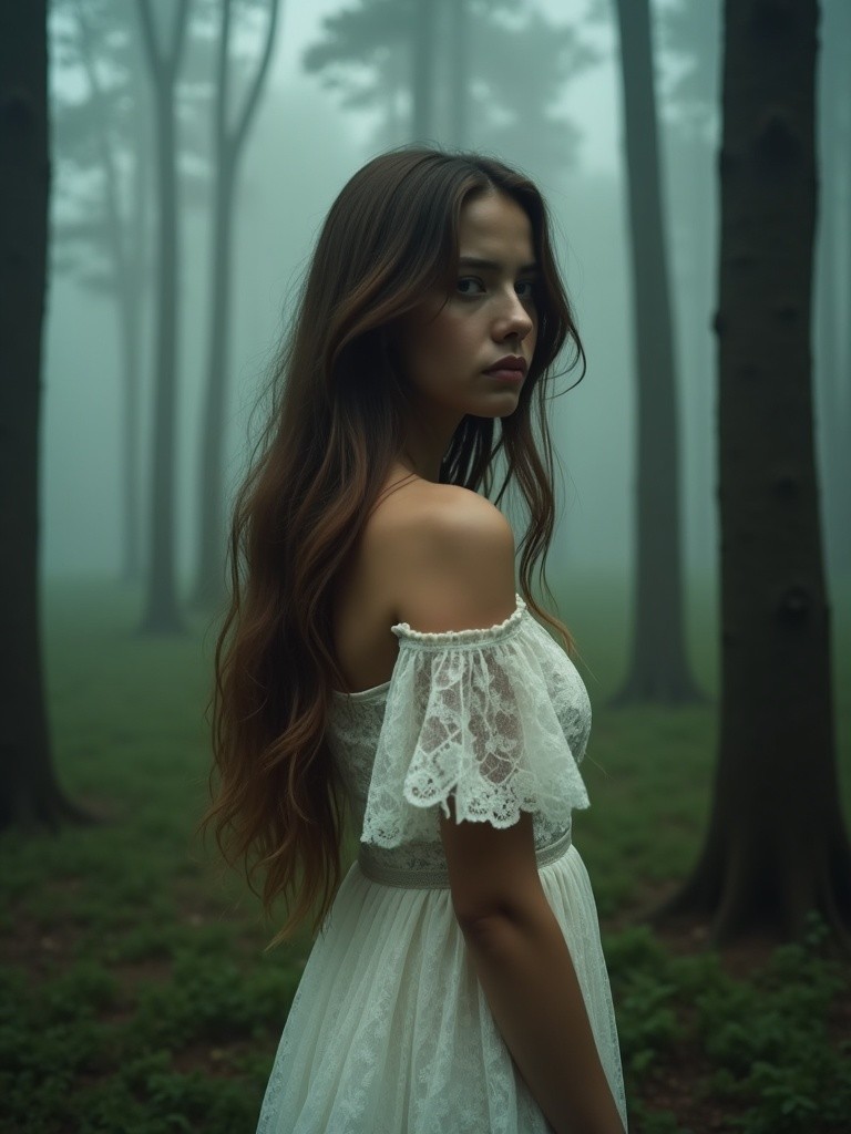 A young woman with long, flowing hair stands in a misty forest, wearing a delicate off-shoulder white dress. The soft light and lush greenery create a serene, enchanting atmosphere.