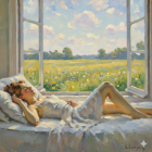 Serene Woman in Sunlit Room with Flower Field View