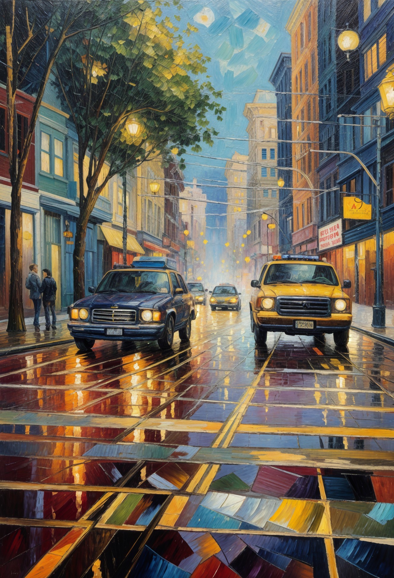 Vibrant City Scene on a Rainy Evening with Skyscrapers