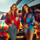 Two stylish women pose next to a brightly colored race car in a pit lane. They wear matching jackets and casual shorts, exuding confidence against a backdrop of racing team activity.