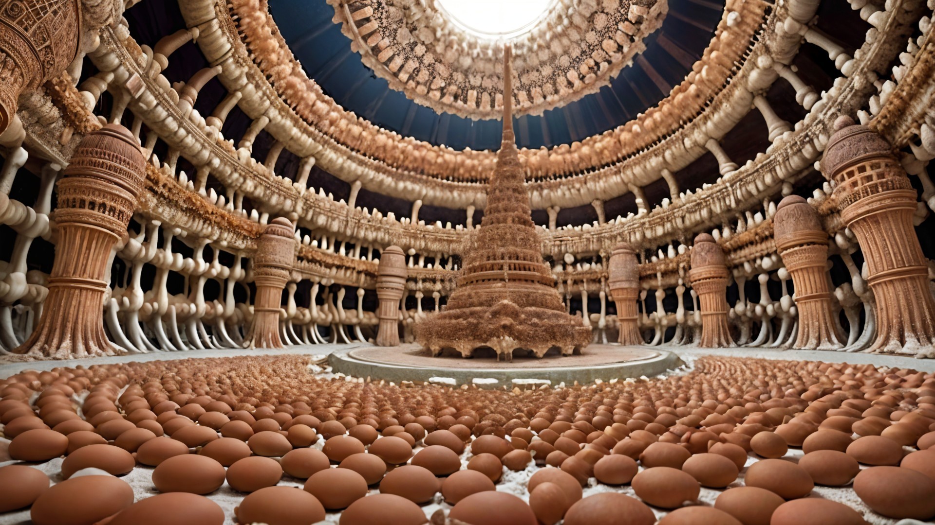 The image depicts a grand, ornate chamber filled with intricate sculptures and a towering structure resembling a natural formation. The floor is scattered with smooth, white eggs, creating a surreal atmosphere.