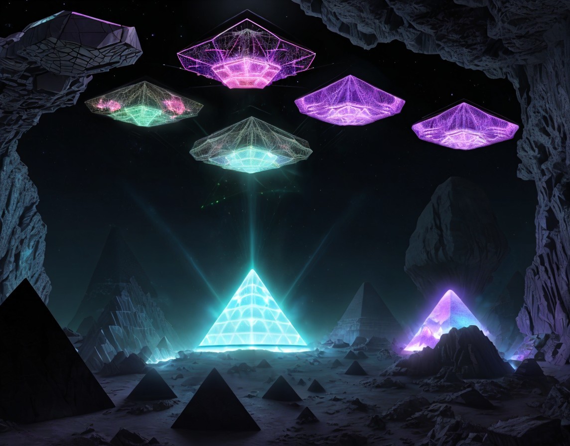Volumetric lighting, 3D geometric vector fractal, High-tech Underground/cavernous DMT laboratory on alien planet, Extraterrestrial pyramid - cosmic menagerie assimilated with sacred geometric patterns and advanced alien technology. Geometric pattern of hexagonal honeycomb glowing with scifi lasers. flying saucers, pyramid with bioluminescent mushrooms and colossal mineral crystals. Alien plants, Realistic and natural elements, under a cosmic sky surrounded by symbols like sacred geometry, mystical talismans and mysterious runes. galactic DMT art, hallucinogenic visionary vibes, shamanic LSD art, and the ethereal DMT realm. In the style of Cameron Gray