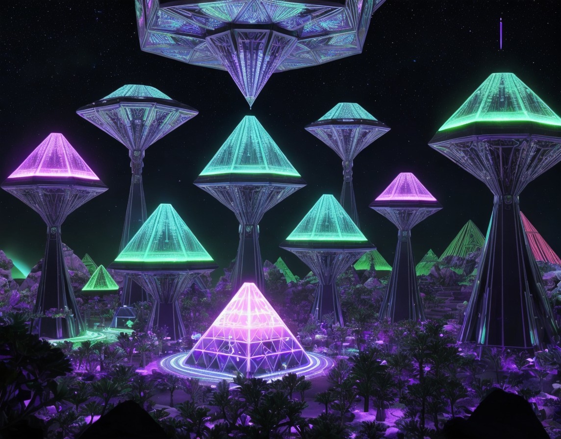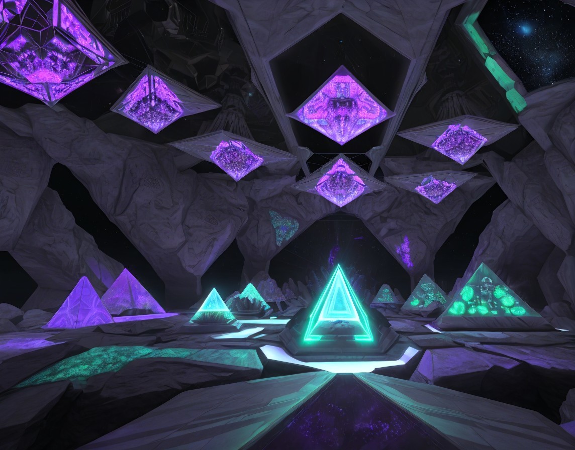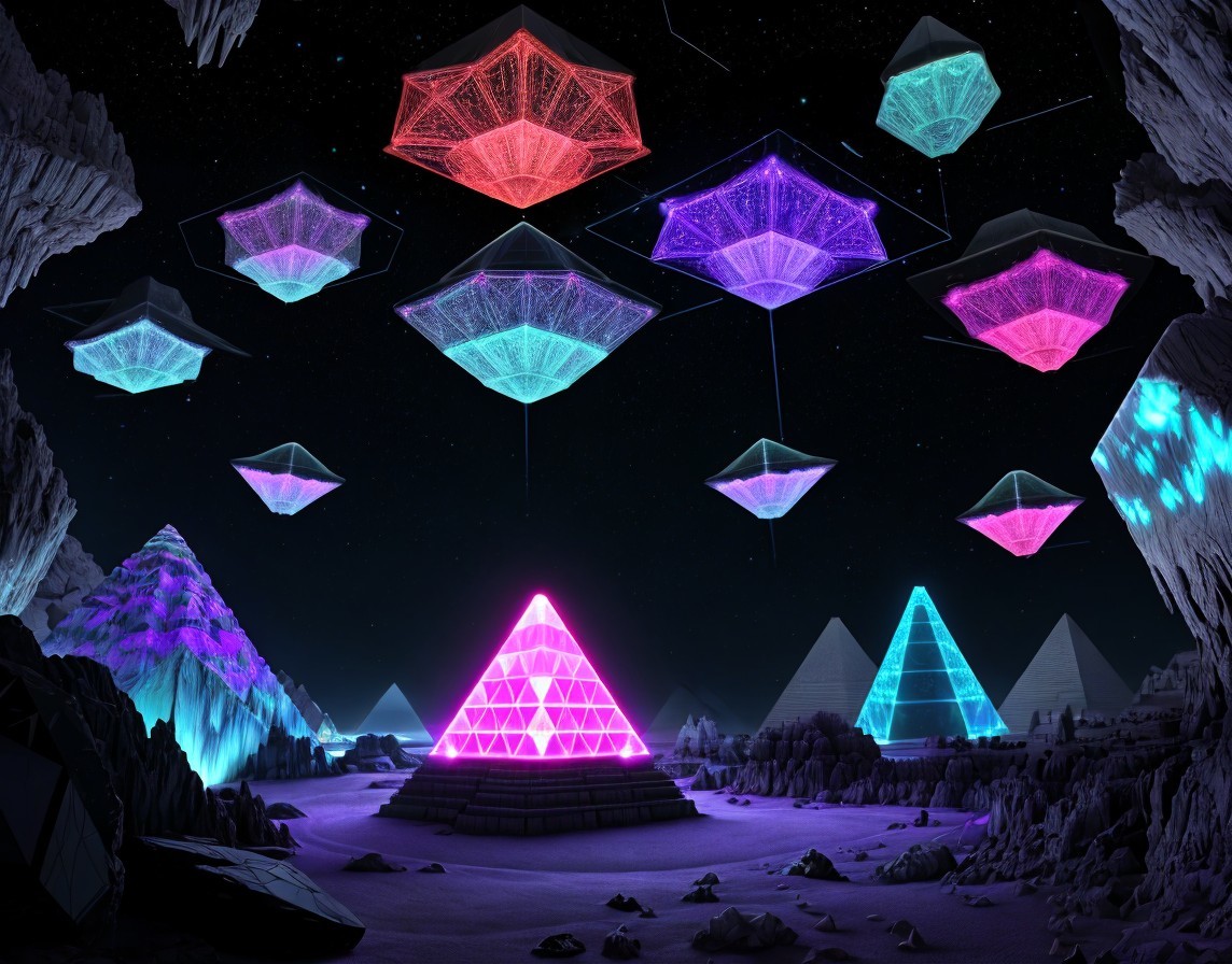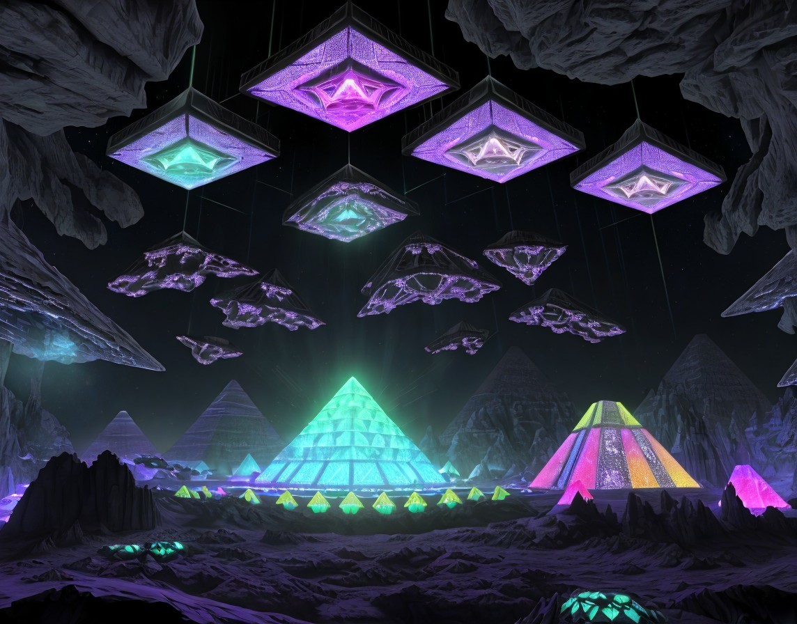 Prompt: Volumetric lighting, 3D geometric vector fractal, High-tech Underground/cavernous DMT laboratory on alien planet, Extraterrestrial pyramid - cosmic menagerie assimilated with sacred geometric patterns and advanced alien technology. Geometric pattern of hexagonal honeycomb glowing with scifi lasers. flying saucers, pyramid with bioluminescent mushrooms and colossal mineral crystals. Alien plants, Realistic and natural elements, under a cosmic sky surrounded by symbols like sacred geometry, mystical talismans and mysterious runes. galactic DMT art, hallucinogenic visionary vibes, shamanic LSD art, and the ethereal DMT realm. In the style of Cameron Gray