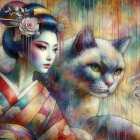 Prompt: The Overhead Gorgeous Portrait Of An Ethereally Ancient Geisha Princess On The Topside Of A Vibrantly Colored And Majestically Textured Giant Cat Guardian. Iridescent Art Nouveau Patchwork. By Daniel Alan Brereton & Luxurious Silk Texture & H. P. Lovecraft & Pale Watercolor Blend & Jean Babtiste Monge & Ink Splatter Gouache & Gerald Brom & Golden Foil Detail & Amanda Clark & Japanese Mokuhanga Art & Dee Nickerson & Wet-On-Wet & Jacek Yerka & Gold Leaf Application & Alphonse Mucha & A Painted Face Full Of Near-Perfect Makeup & Arthur Rackham & Highest Definition Possible & ∞