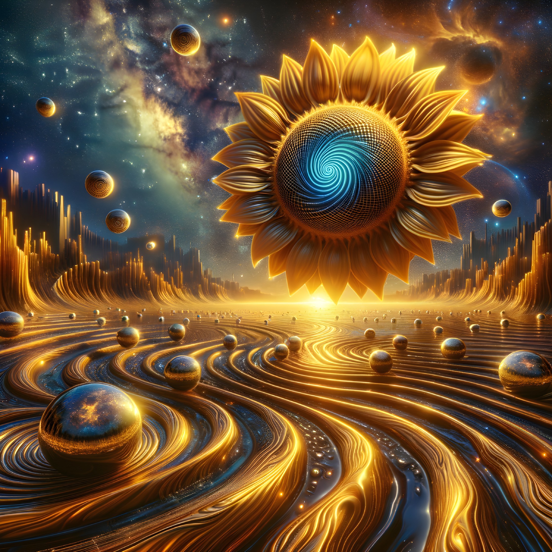 A surreal landscape with a giant sunflower, swirling patterns on the ground, reflective spheres, and a celestial sky with stars and planets.