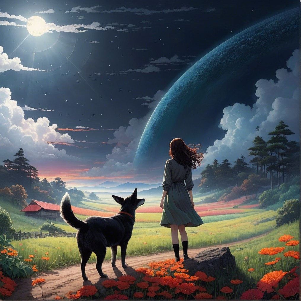 A vibrant forest scene features blooming flowers in the foreground, with butterflies fluttering about. In the background, a warm sunset illuminates the trees and lush greenery, creating a serene atmosphere.