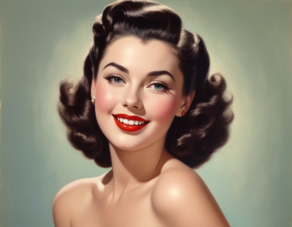 A classic, glamorous portrait of a woman with wavy hair, red lipstick, and subtle jewelry, evoking a vintage feel.