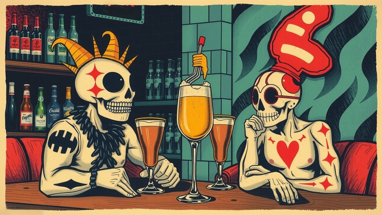 A whimsical scene unfolds as a pictogram and a pictograph visit a bar, ordering a unique drink and side dish. The atmosphere buzzes with eclectic influences, blending Dadaism and vibrant punk energy.