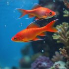 Two vibrant goldfish swim gracefully in a clear aquarium, surrounded by colorful coral and bubbles rising gently in the serene blue water. Their shimmering scales reflect light beautifully.