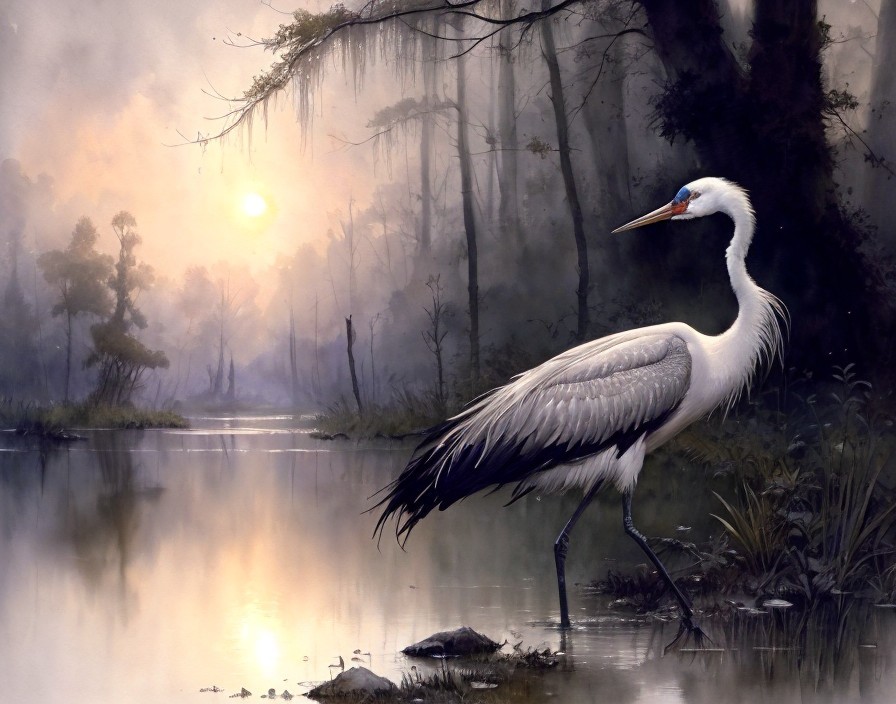 ( Try it from Soramet ) An elegant crane stands by a serene river at dawn, with the sun casting a soft glow through the misty forest backdrop.