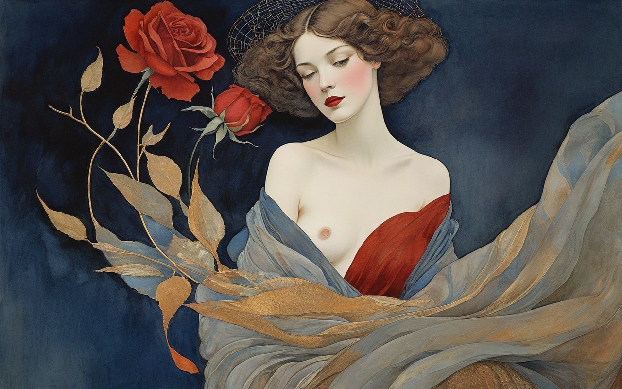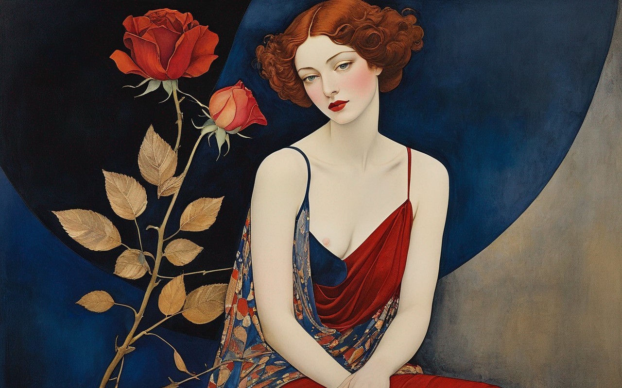 whimsical, beautiful, poignant, touching. colors rose, gold, rust, indigo, burgundy, black. soft watercolor extra water in Art Deco by Annigoni, Egon Schiele, Milo Manara, Botticelli, Catrin Welz-Stein, Jean Metzinger, Klimt, perfect eyes, perfect hands face , highly detailed, complementary colors, hyper detailed. Watercolor and ink splatter, dynamic pose, valentine emotion