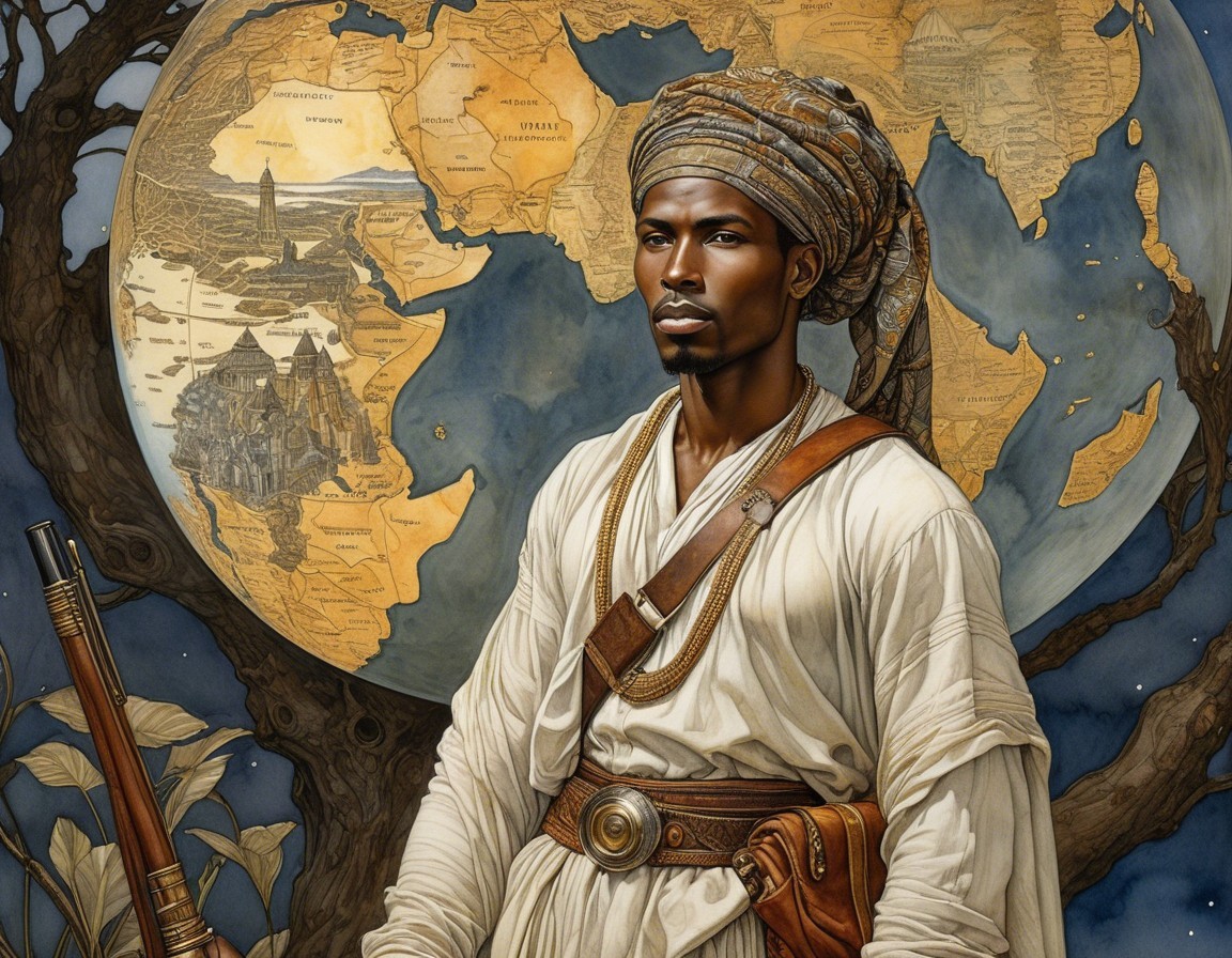 A strong African man stands in a lush landscape at sunrise, wearing a hat and traditional attire. Behind him, thatched huts and a figure walk down a path through vibrant vegetation.