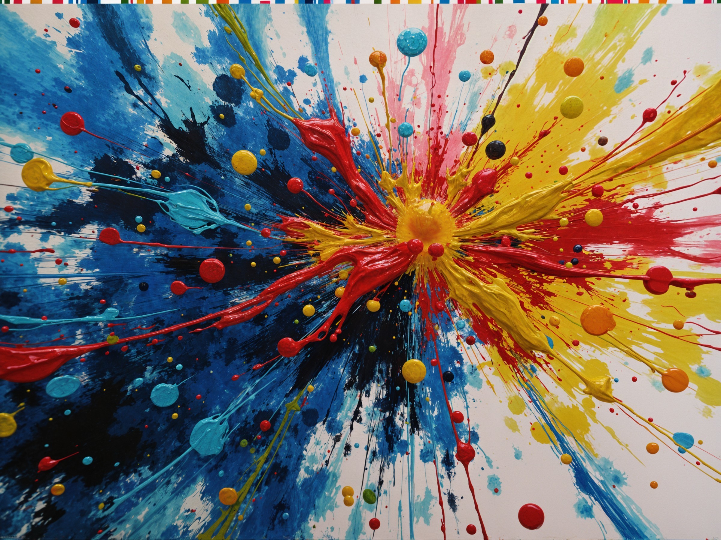 A vibrant explosion of color featuring bold yellows, reds, and blues. Swirls and splatters create a dynamic, energetic design, with circular accents adding depth and texture to the artwork.
