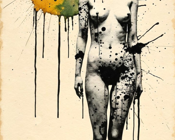 The artwork features a silhouette of a woman walking, surrounded by colorful, splattered circles. The contrast between black ink and vibrant hues creates an engaging blend of form and color.