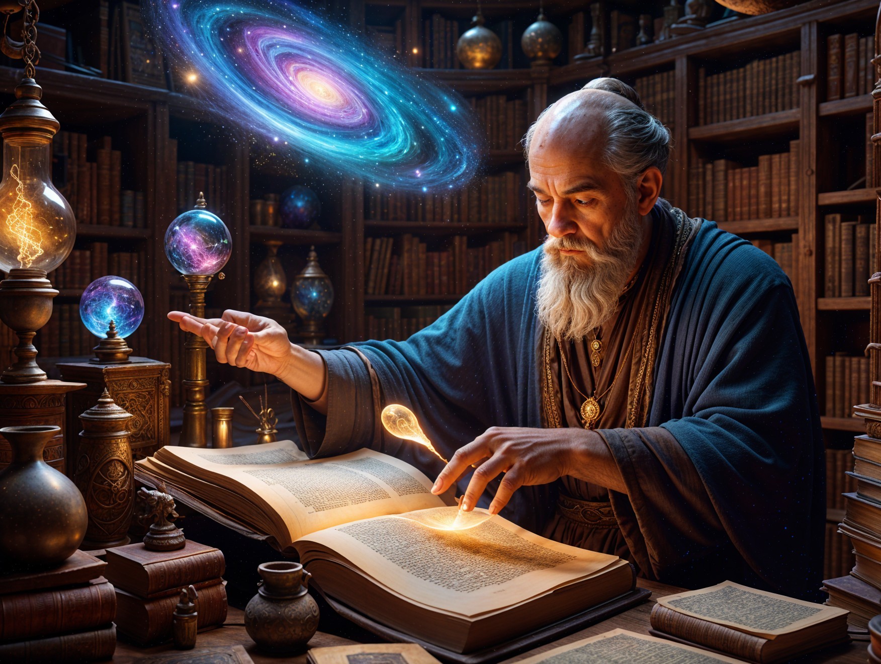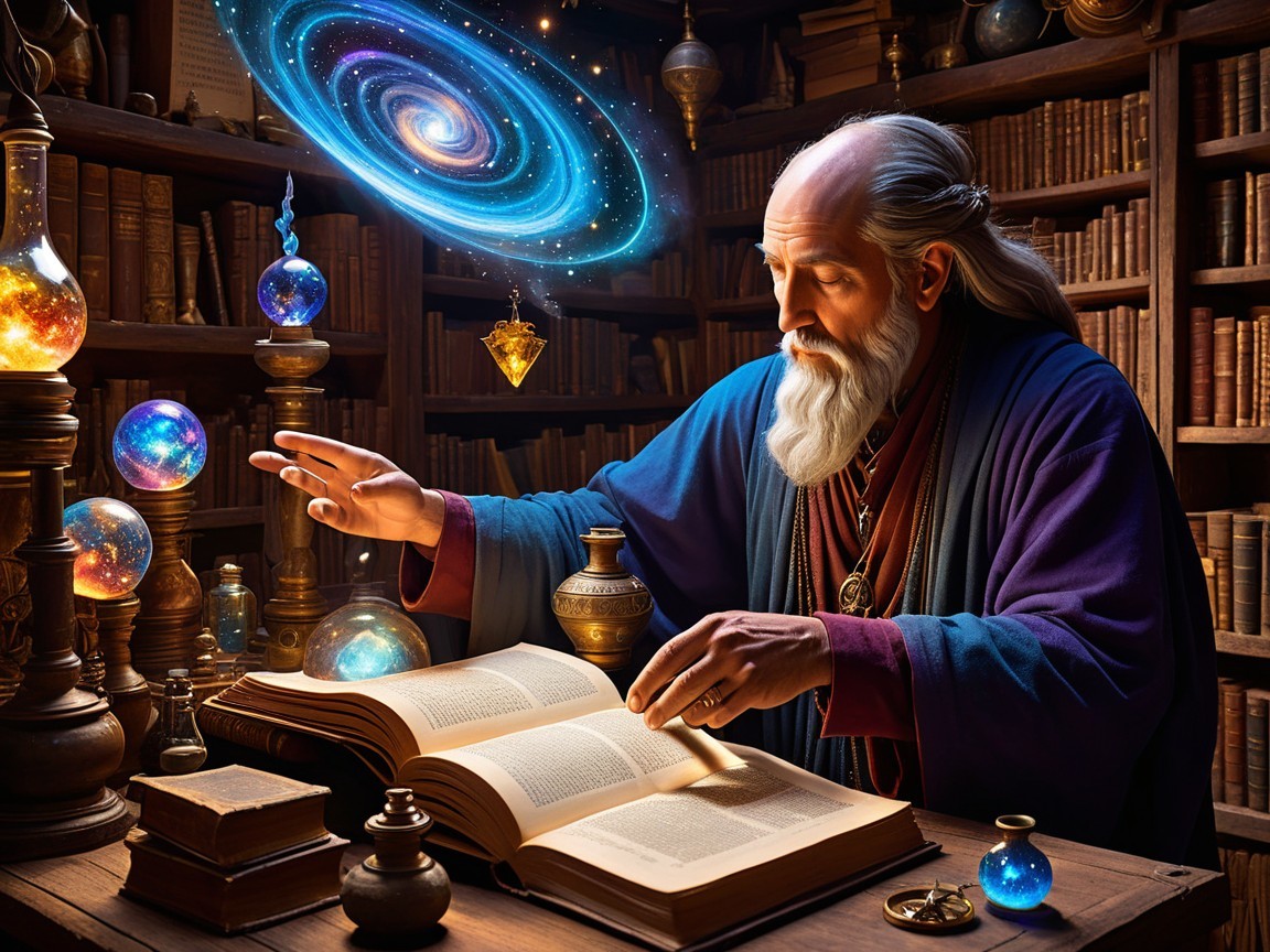 An elderly wizard sits in a library, conjuring celestial orbs from an ancient book. Surrounded by books and glowing candles, he gestures toward a swirling galaxy, embodying magic and knowledge.