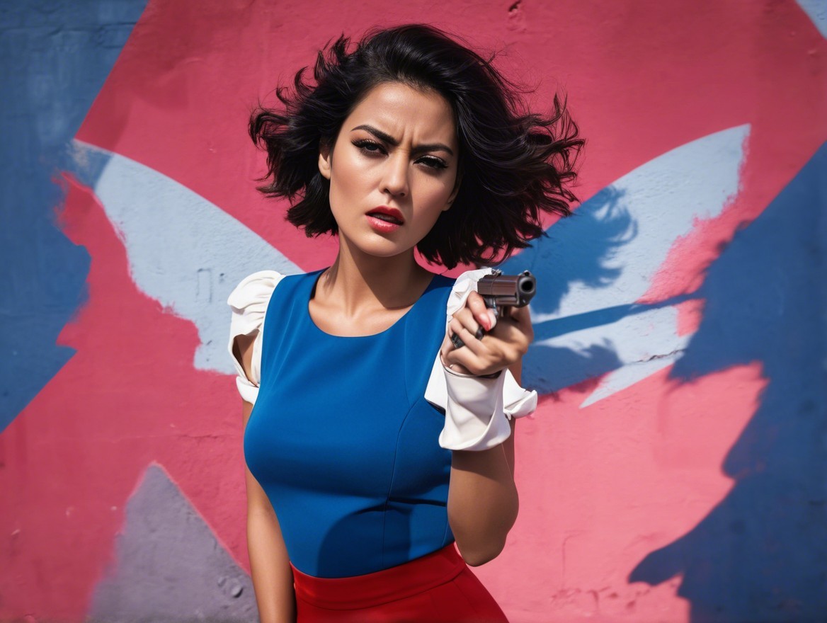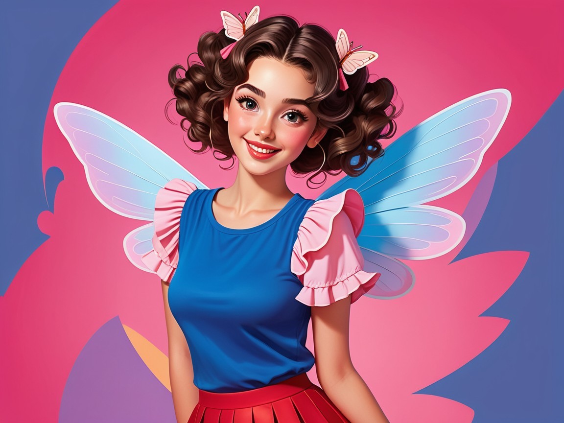 Prompt: "Whimsical young woman illustration, fairy-like character, large expressive eyes, rosy cheeks, warm friendly smile, dark wavy updo hair, decorative antennae or insect wings hair accessory, blue top with ruffled sleeves, red skirt or shorts, vibrant pink background, cartoonish style, classic comic book aesthetic, playful and energetic vibe, fantasy character design, digital illustration, vibrant colors, detailed linework, whimsical charm, fantasy trading card inspiration, enchanting and lighthearted feel, whimsical fashion design."