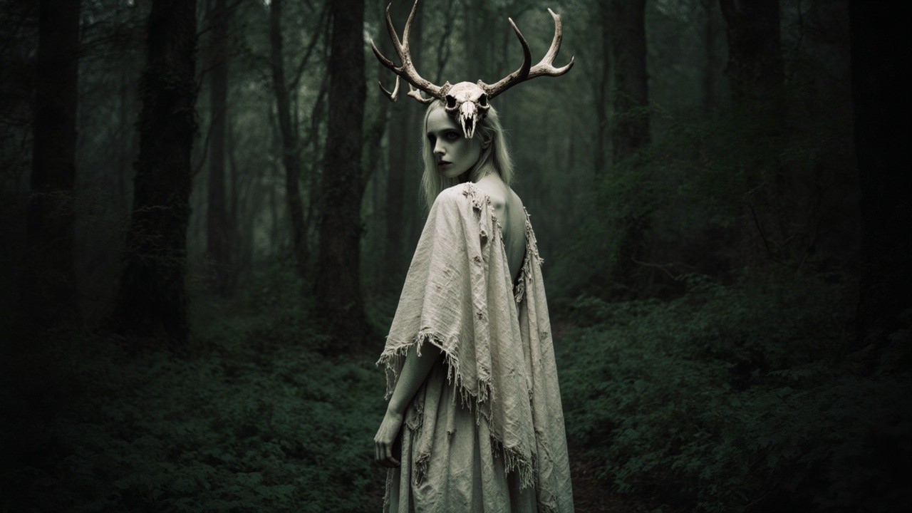 Prompt: "A spectral figure in a dark forest, wearing a tattered, layered gown of off-white linen, crowned with a bleached skull and antler headdress, looking over shoulder toward the viewer. The scene is set amidst dense, green foliage. The costume’s texture is rough, aged, and distressed. The artistic style leans towards dark fantasy, with a somber color palette of muted greens, grays, and off-whites. The composition is a medium shot, enhancing the figure's presence, with the background providing depth. Lighting is soft and diffused, creating a mysterious atmosphere. Texture is prominent, both in the garment's frayed edges and the forest’s organic details. The mood is melancholic and unsettling, with a touch of ethereal beauty. Desaturated color palette, dramatic lighting, detailed textures, eerie atmosphere. High resolution, photorealistic."