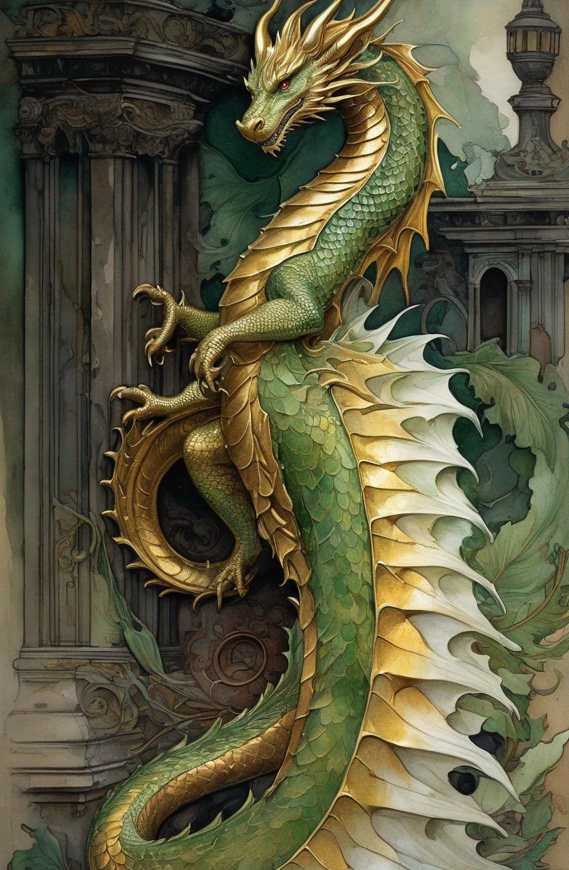 + Prompt:Fantastic green and gold dragon. gold foil detail
