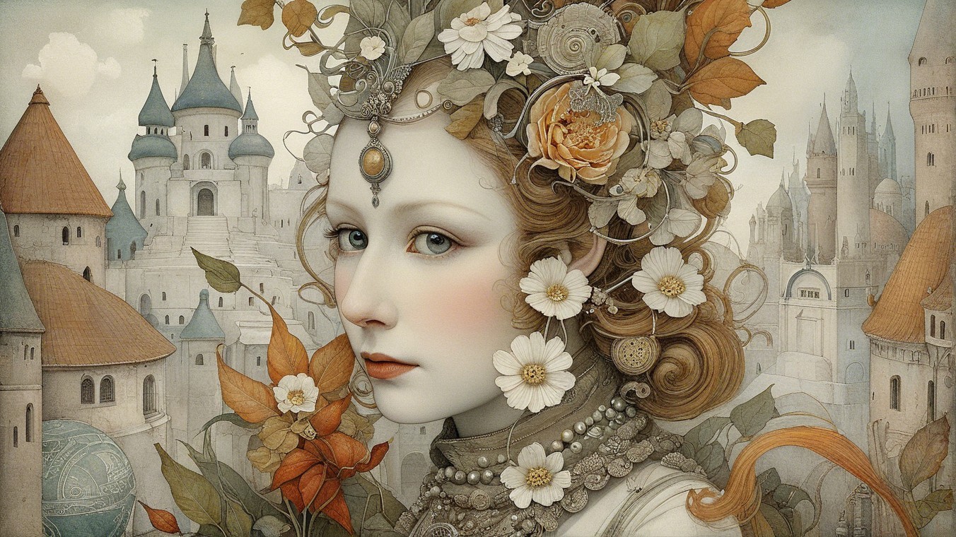The image features an elegant woman with intricate jewelry and a floral headdress, set against a dreamy, historical cityscape. Her serene expression evokes a sense of beauty and mystery.