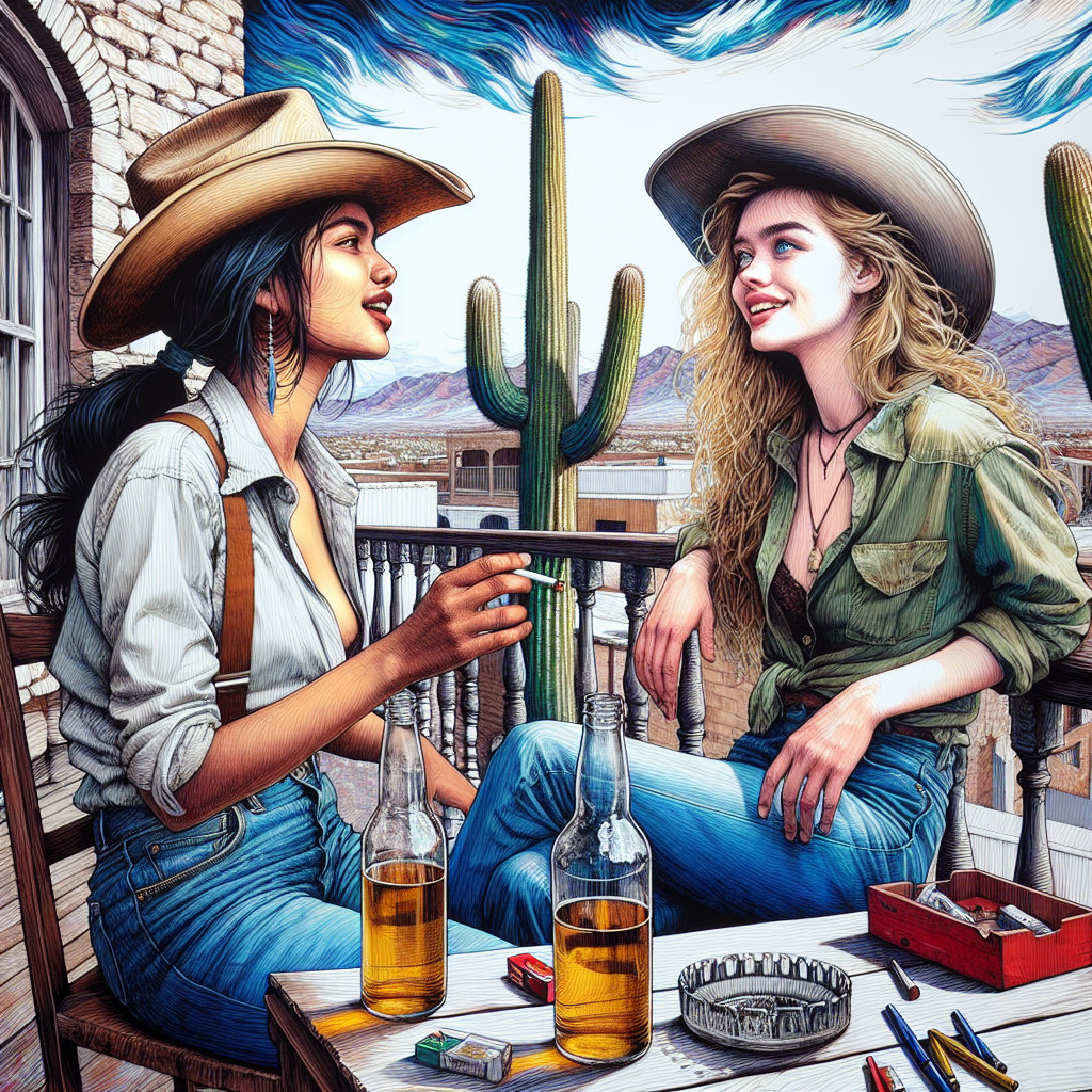 Two women in cowboy hats sit on a balcony, enjoying drinks. They have relaxed expressions, surrounded by cacti and a scenic backdrop of mountains, capturing a laid-back, Western vibe.