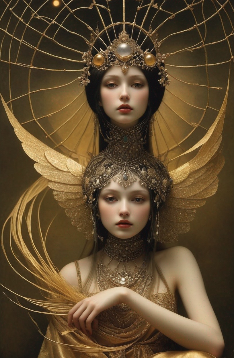 Ethereal fantasy portrait of two figures with intricate headpieces and jewelry, one holding a bird,
