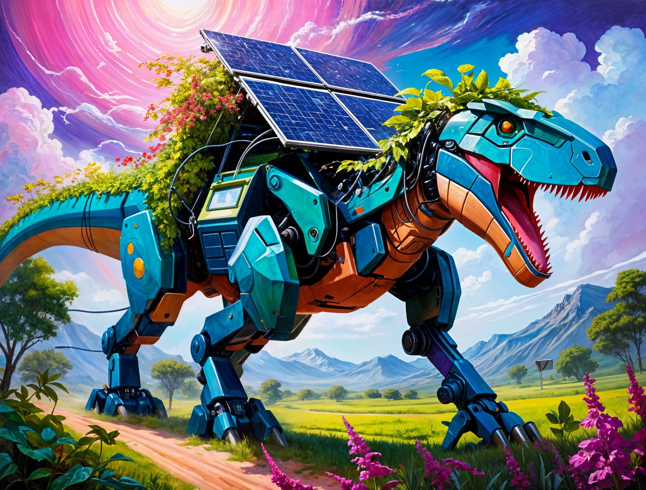A vibrant, colorful illustration of a robotic dinosaur, equipped with solar panels and covered in lush greenery, traverses a scenic landscape under a dramatic, swirling sky.