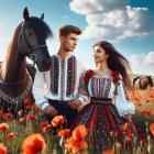 A young couple in traditional attire stands in a vibrant poppy field, accompanied by a horse. The sun sets behind them, casting a warm glow over the scenic rural landscape.