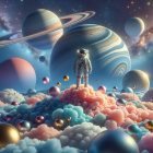 An astronaut stands on colorful, fluffy clouds, surrounded by vibrant planets and shimmering spheres, under a starry sky. The scene blends whimsy with cosmic wonder, creating a dreamlike atmosphere.