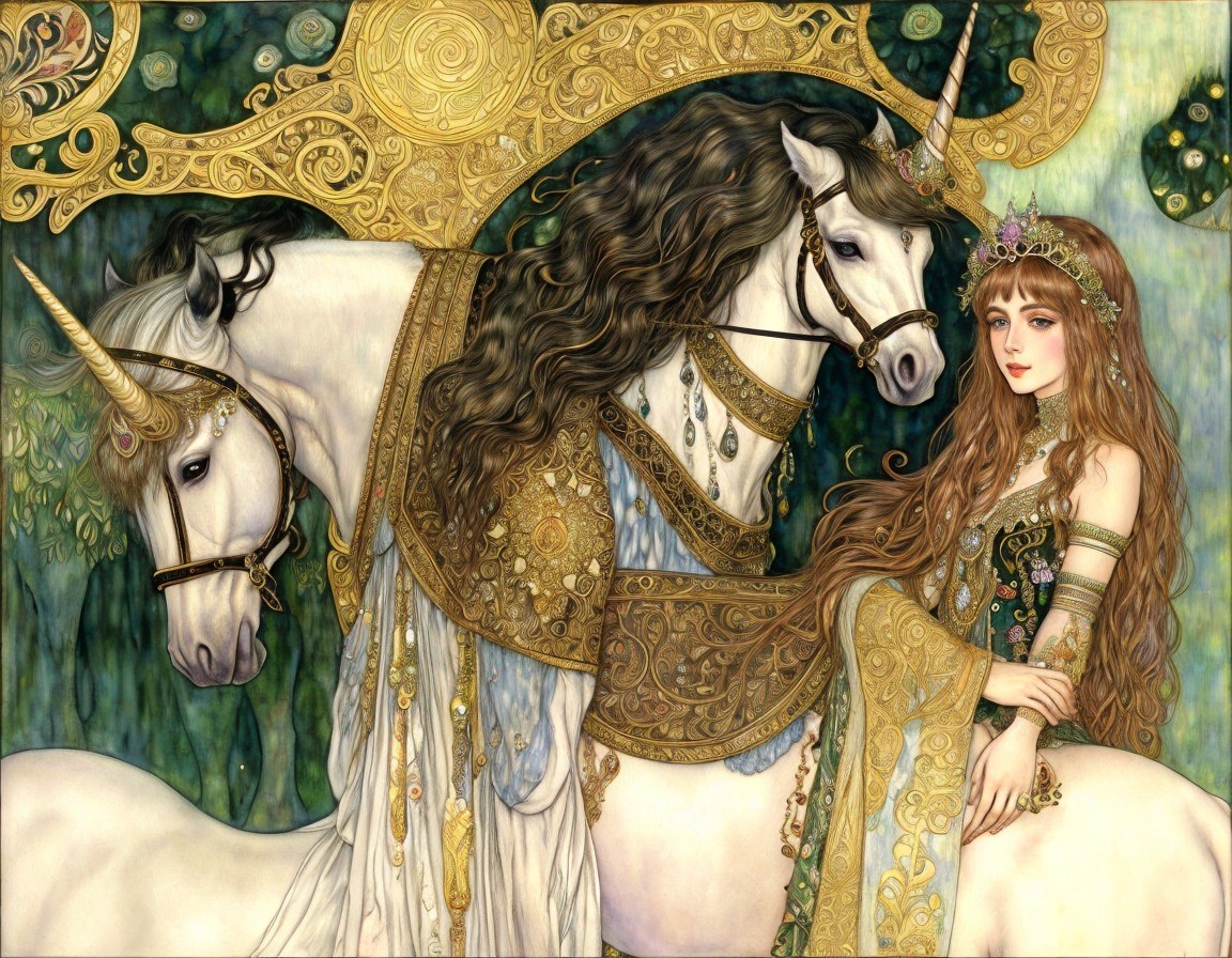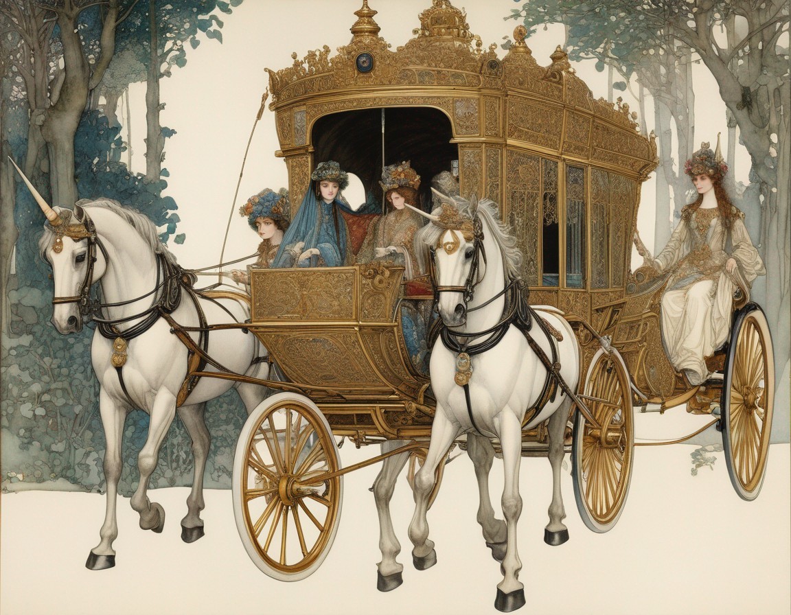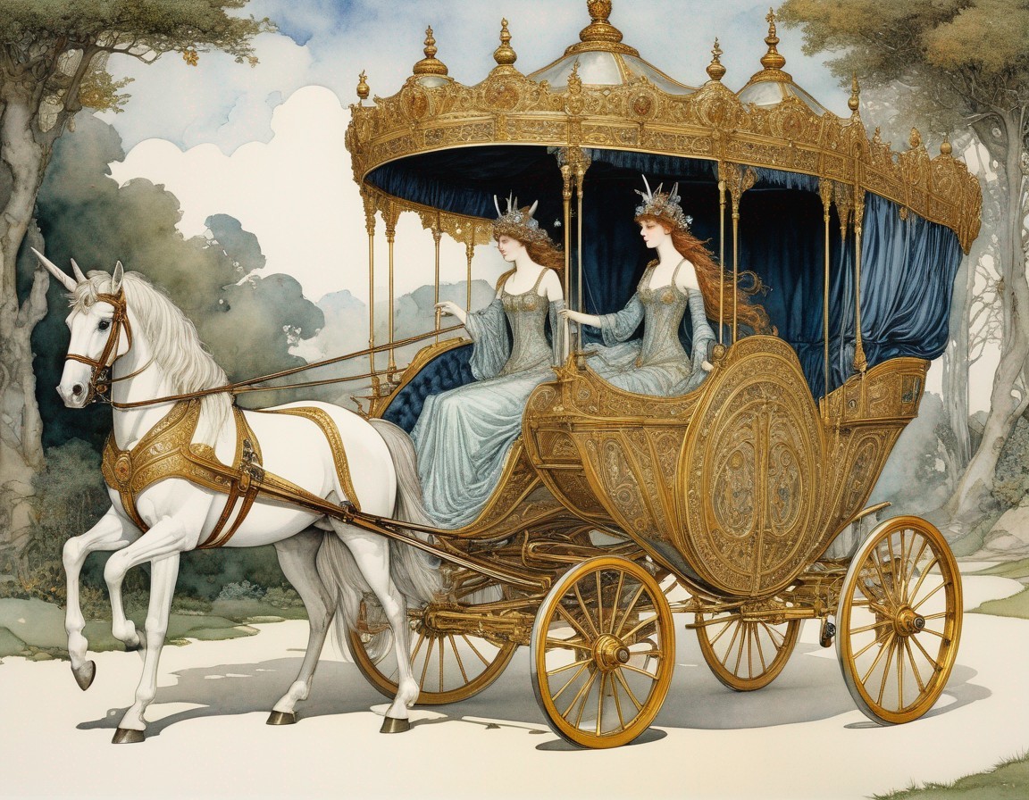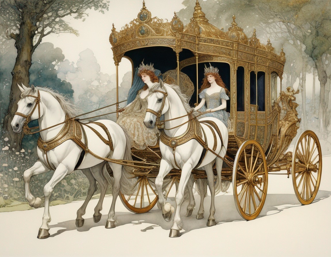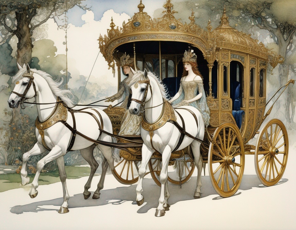 An ornate golden carriage with two elegant women inside is pulled by a white horse against a backdrop of trees.