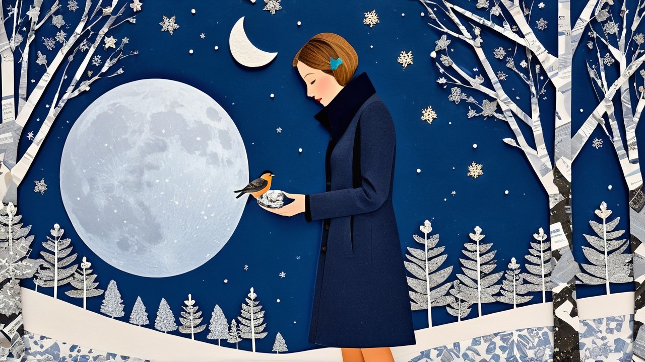 A digital collage of a woman in a navy overcoat feeding a bird, with an enormous moon, a crescent moon, snowflakes, and bare trees in a winter scene on a deep blue background, in the style of paper collage, flat illustration, and digital painting.