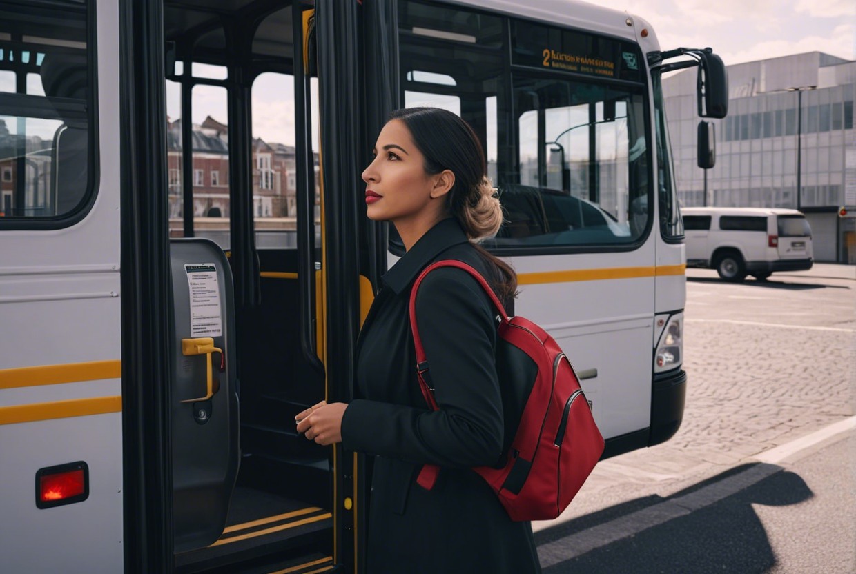 A young woman with long, dark hair stands at a bus stop, holding a phone and looking toward a bus. She wears a black coat and carries a red backpack, set against an urban backdrop.