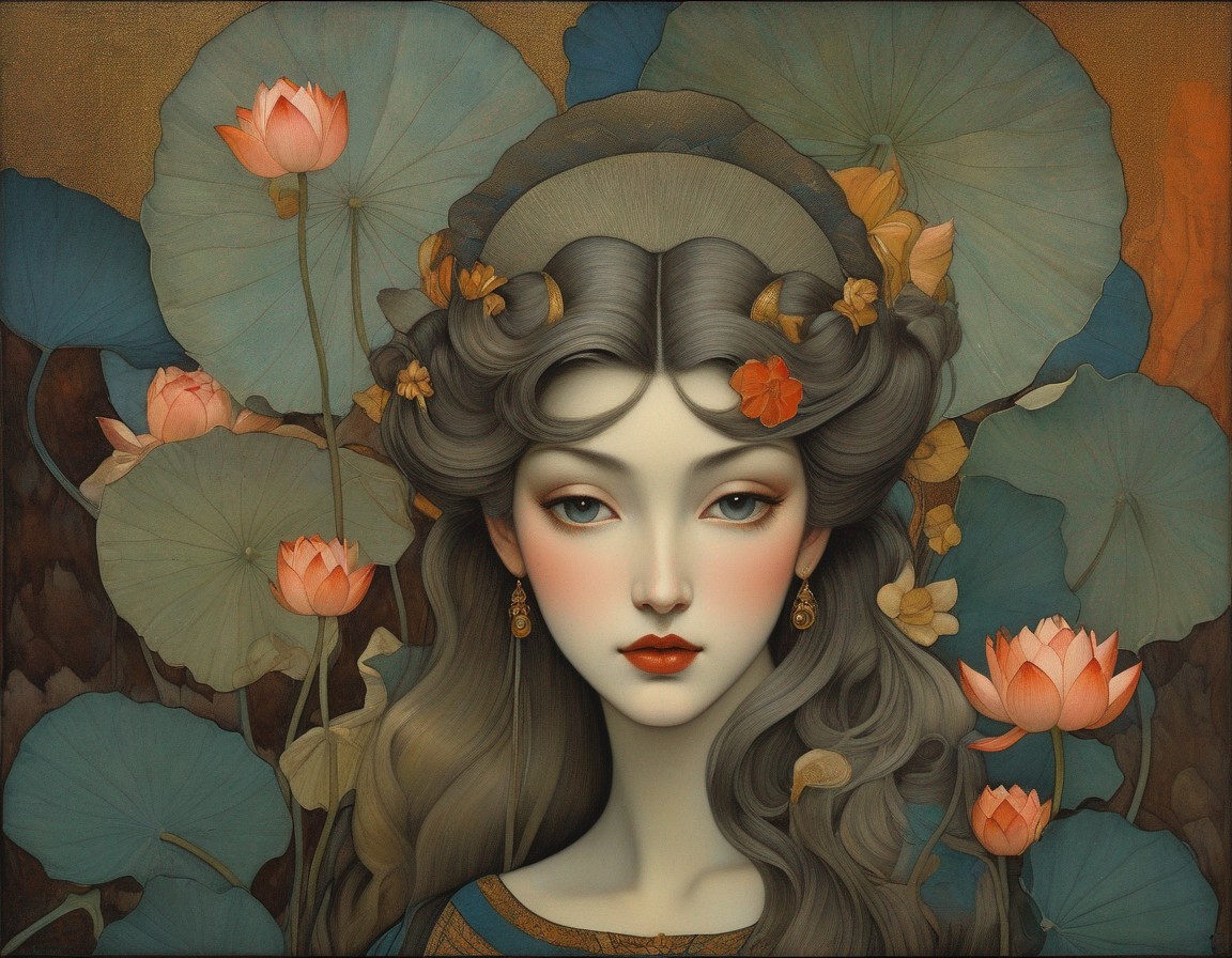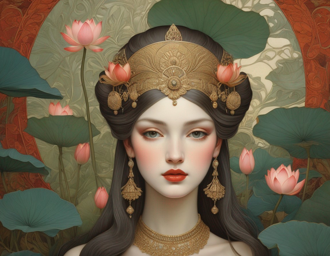 An illustration of a woman with a golden crown and jewelry, surrounded by lotus flowers and leaves against a red backdrop.