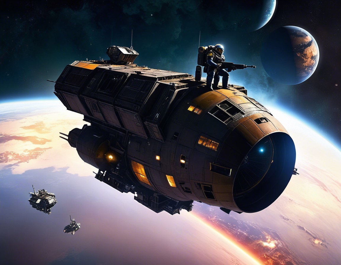 Astronaut standing on a spacecraft with other ships and planets in the background, depicting a sci-fi space scene.