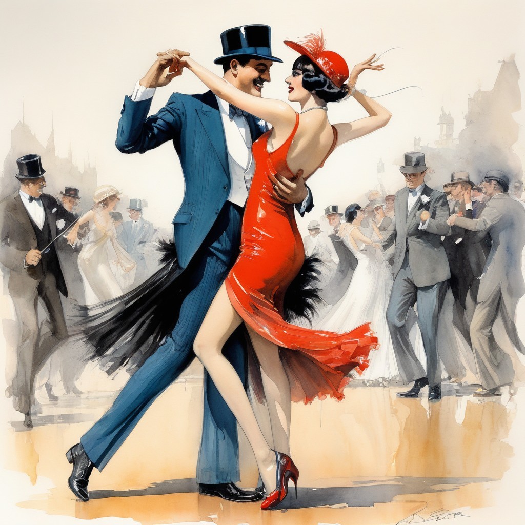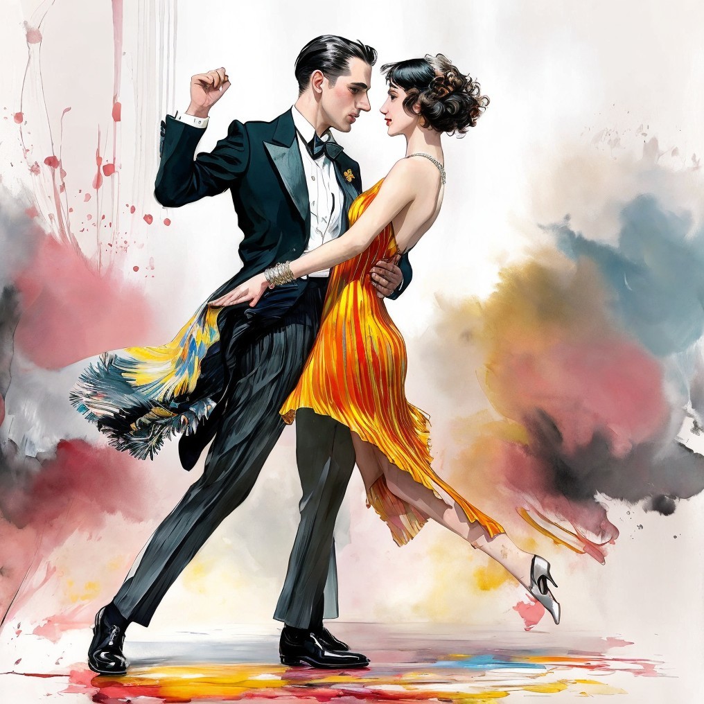 Roaring Twenties (!920's) couple dancing as drawn by Ralph Steadman and Gerald Scarfe. Splash art.