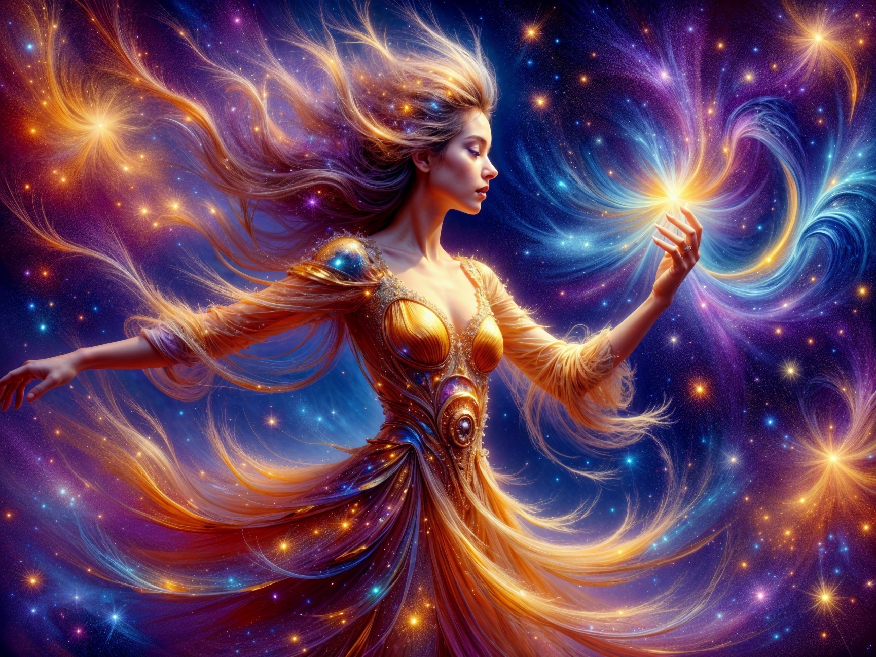 A stunning figure in a richly adorned golden and purple gown dances gracefully against a cosmic backdrop of vibrant stars and swirling galaxies, exuding elegance and mystique.