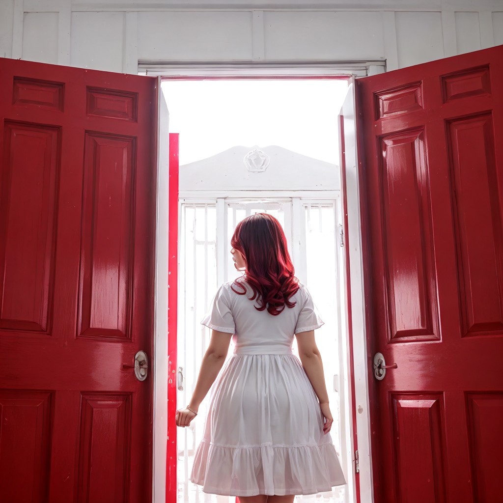 A woman with pink hair in a white dress stands in front of an open red door, looking outside.