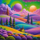 A vibrant alien landscape features rolling hills in bold purples and oranges, dotted with lush green trees, under a surreal sky filled with colorful planets and fluffy clouds.