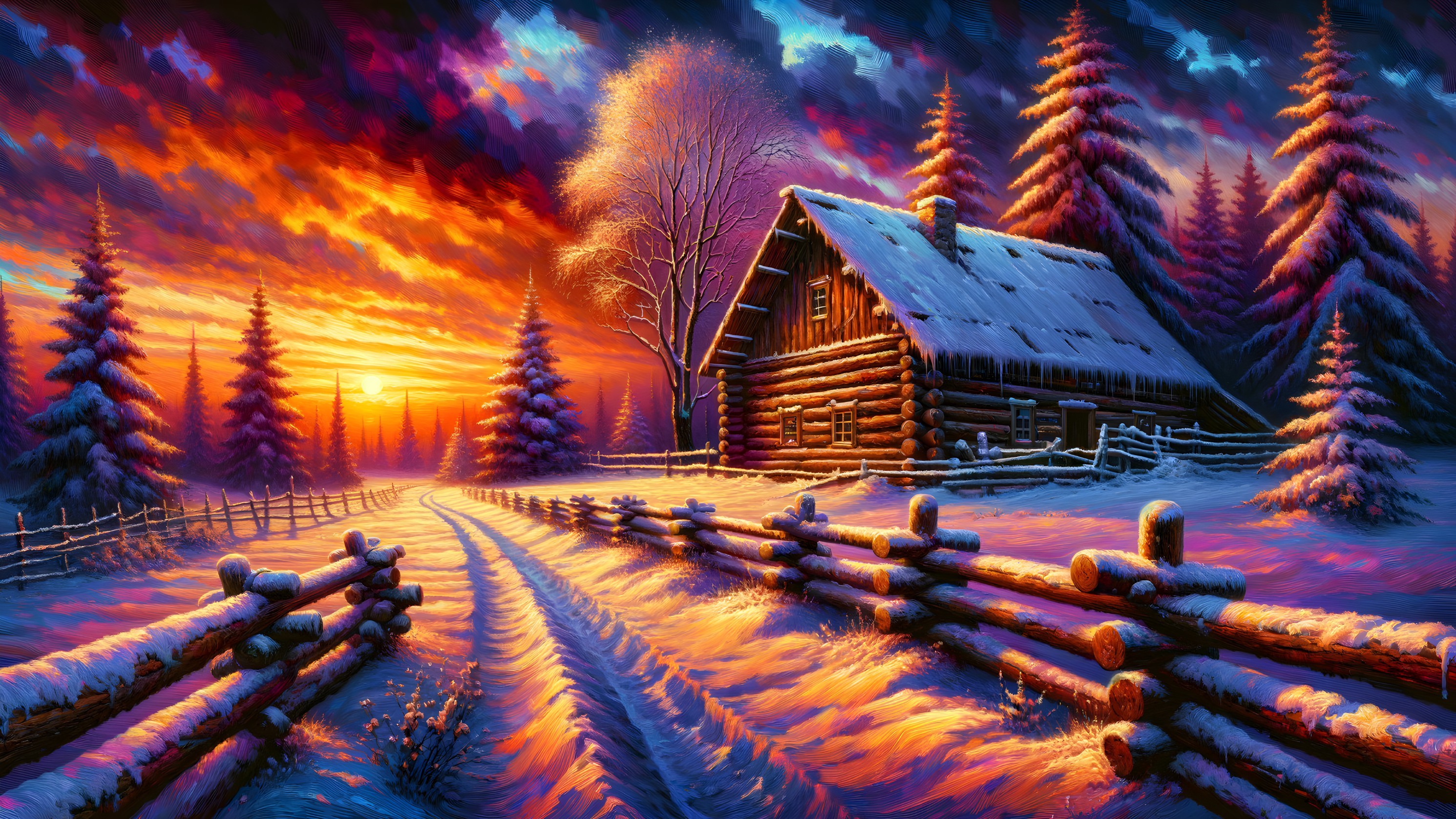 A serene winter scene features a cozy log cabin surrounded by snow-covered trees, with a vibrant sunset casting warm hues across the sky and reflecting on a snowy path.