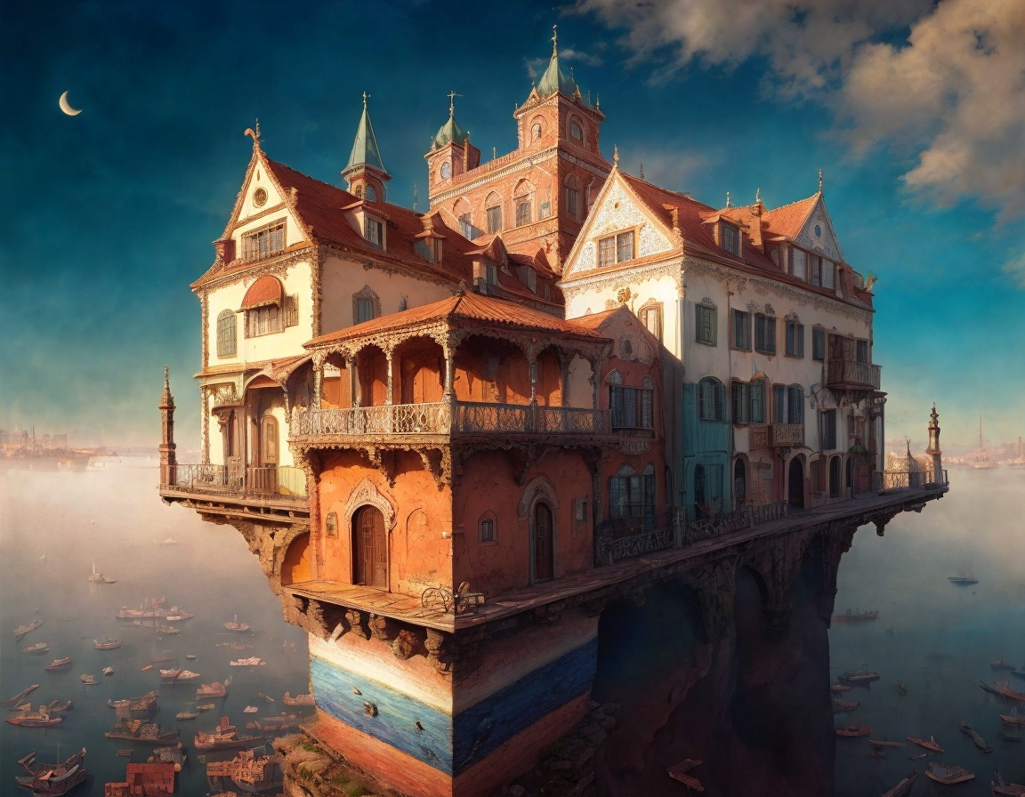 Romanticism style venetian villa in the sky amidst the clowds, gondolas floating around, dream a little dream, hand-coloured litho chromolithograph, in the style of Erik Johansson, by Patrice Murciano .