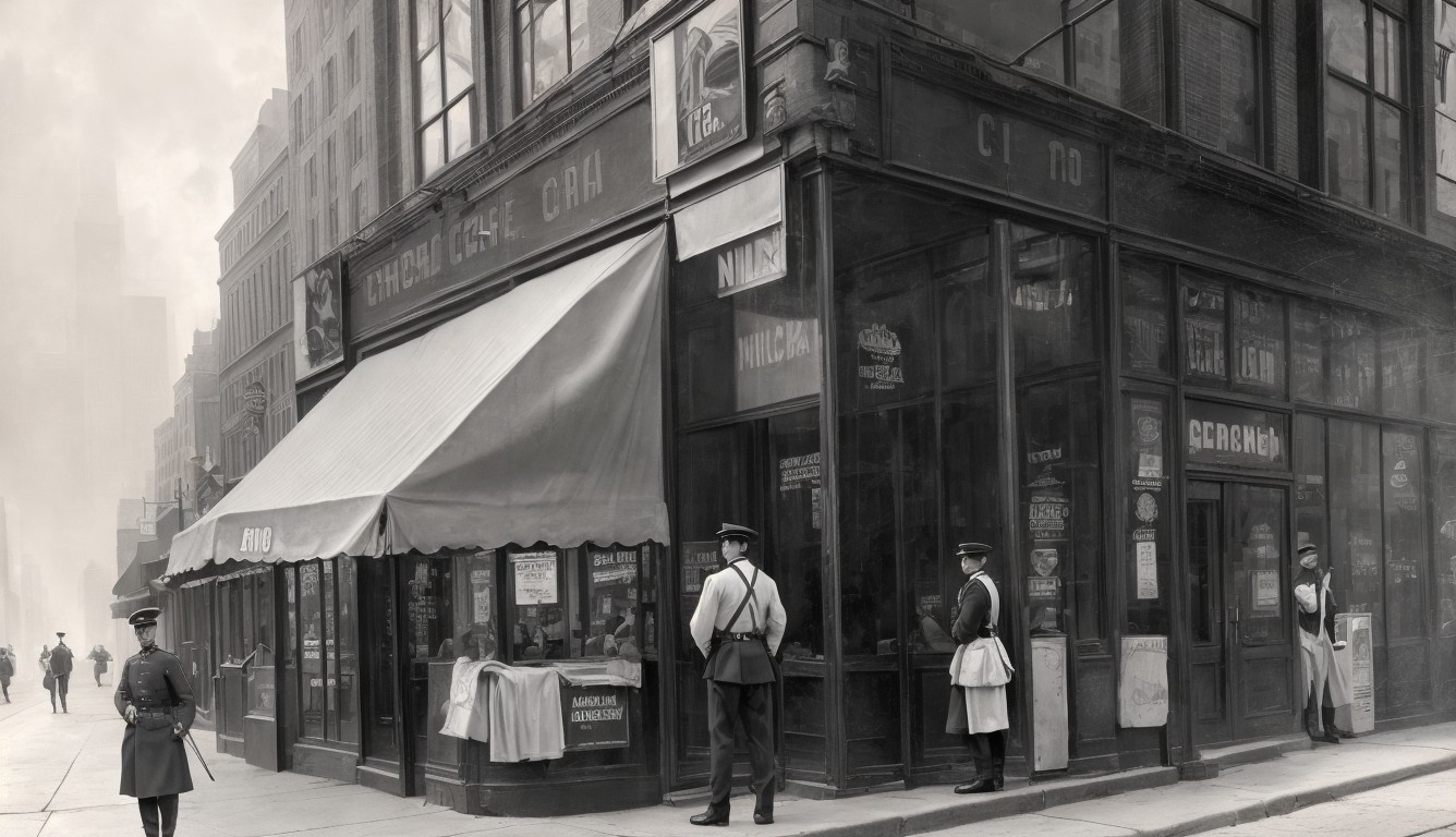 Vintage city street corner with pedestrians and classic storefronts in monochrome.