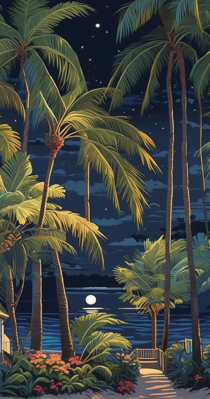 + Prompt:Create a detailed digital painting of a beach scene depicting a cute beach cottage with a lot of prominent tropical palm trees and sea grape plants, on a night with a normal sized full moon. In the style of Kaoru Yamada, Matisse, Gauguin.