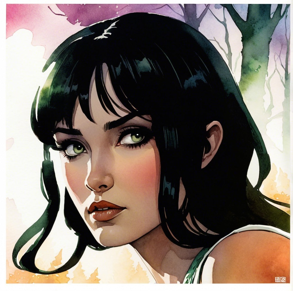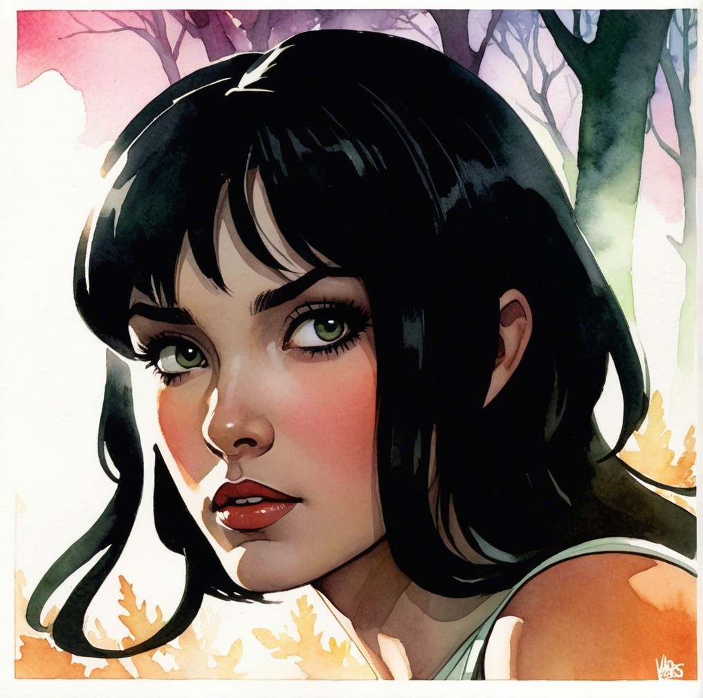 Watercolor and ink, stylized close-up, juvenile enchantress, stylized forestal background, stacked-up perspective, wide angled view, occult theme, mysterious, naturalistic comic book art merged with abstract lineage style, Ho Baron inspiration, William Bradley lighting, gradient inking colors, liminal, traumacore elements, overexposure. Foampunk features, appropriateness, accuracy, skills, shadow mapping, parallax occlusion 1.8, subsurface scattering 1.2, art nouveau embellishment, intricate details, joyful, dystopian, stylized face, cel-shaded by Henri de Toulouse-Lautrec, zentangle influence, Bloom-Effect, subsurface scattering, textured layers, painterly elements, glossy,UHD, plasticity 1.4, HDR, blurred outlines, triadic color scheme light-purple mahogany sea-green, watercolor effects by C. Griffiths. Raytraced shadows 1.3, divisionism techniques, luminism, sfumato-effect, dreamcatching, tall and lean details, quilling, watery thinned colors, watercolor details, nuanced painterly effects, worn and rough surface, stippled, blotted, tesselated, debeh, bokeh, Haddon Sundblom hues, acrylic art techniques, oxidian hues, golden shadows, retro flair, naturalistic vibe, luminism and tonalism reference in contouring outlines by Ho Baron, vertical layout, emulsion lifts, whimsical gothic elements, ancient blurred background, angled, squiggly splash art, 3 point lighting, glowing bioluminescent aura,, luminous plasticity 1.4, overall composition by Cameron Gray. Very joyful and serene atmosphere. Post-avantgarde reminiscence.