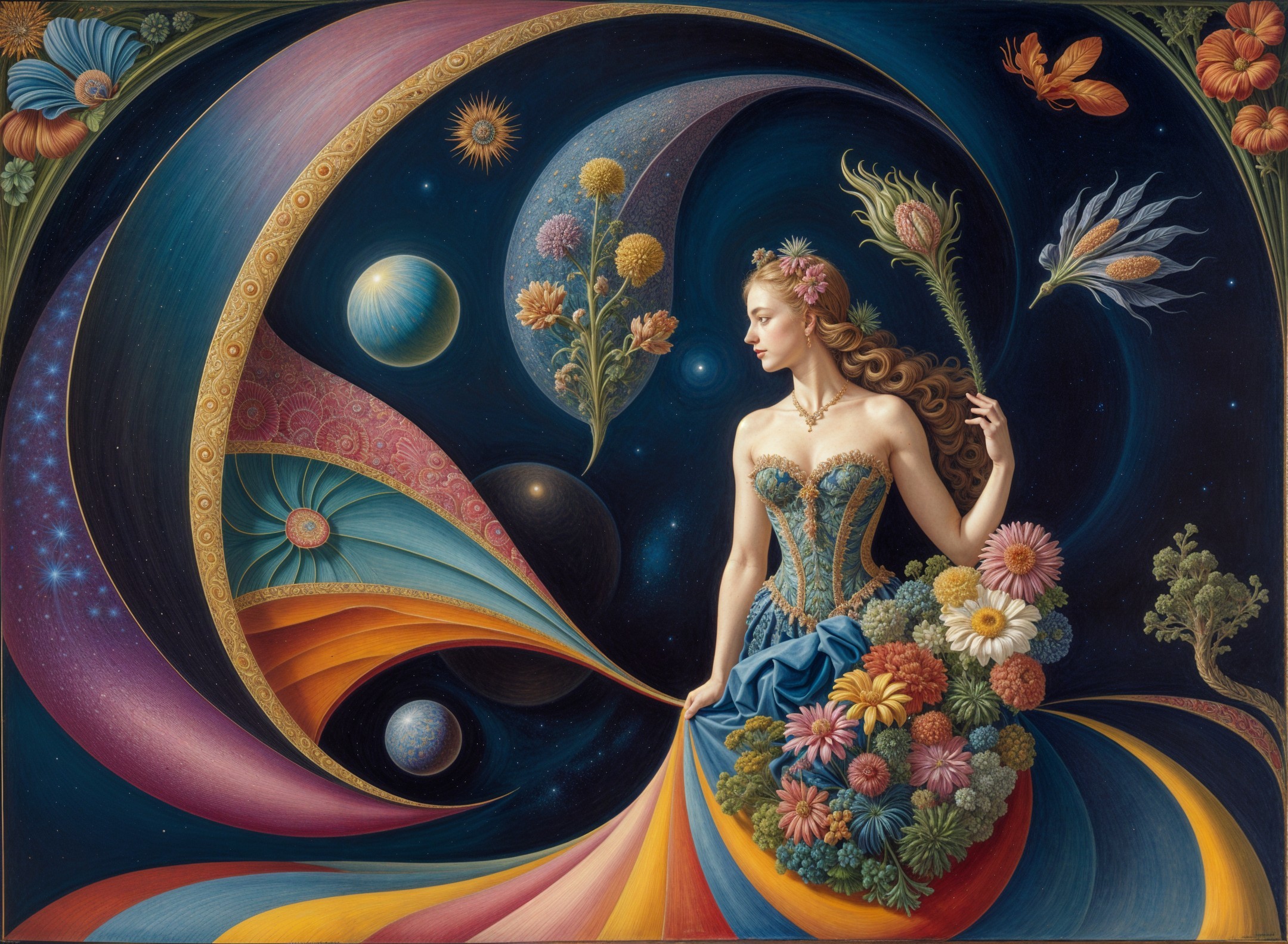 A vibrant, enchanting woman in a colorful floral gown, surrounded by intricate patterns of leaves and blossoms, exuding a magical, fairy-tale essence. Rich colors and details create a stunning visual.