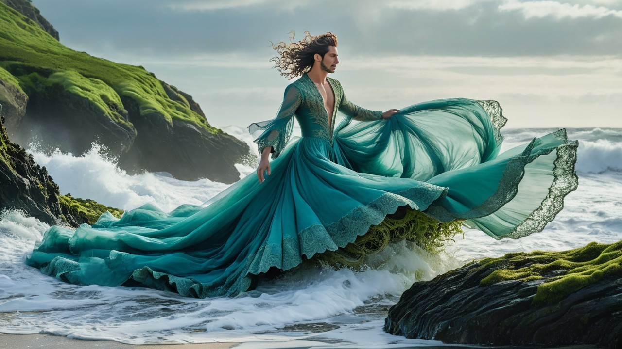 A figure in a flowing teal gown stands gracefully on a rocky shoreline, surrounded by crashing waves and lush greenery, creating a striking contrast against the dramatic coastal backdrop.