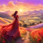 A woman in a flowing red dress stands in a vibrant field of flowers, gazing at a sunset that bathes the landscape in warm hues. Rolling hills stretch into the distance, creating a serene backdrop.