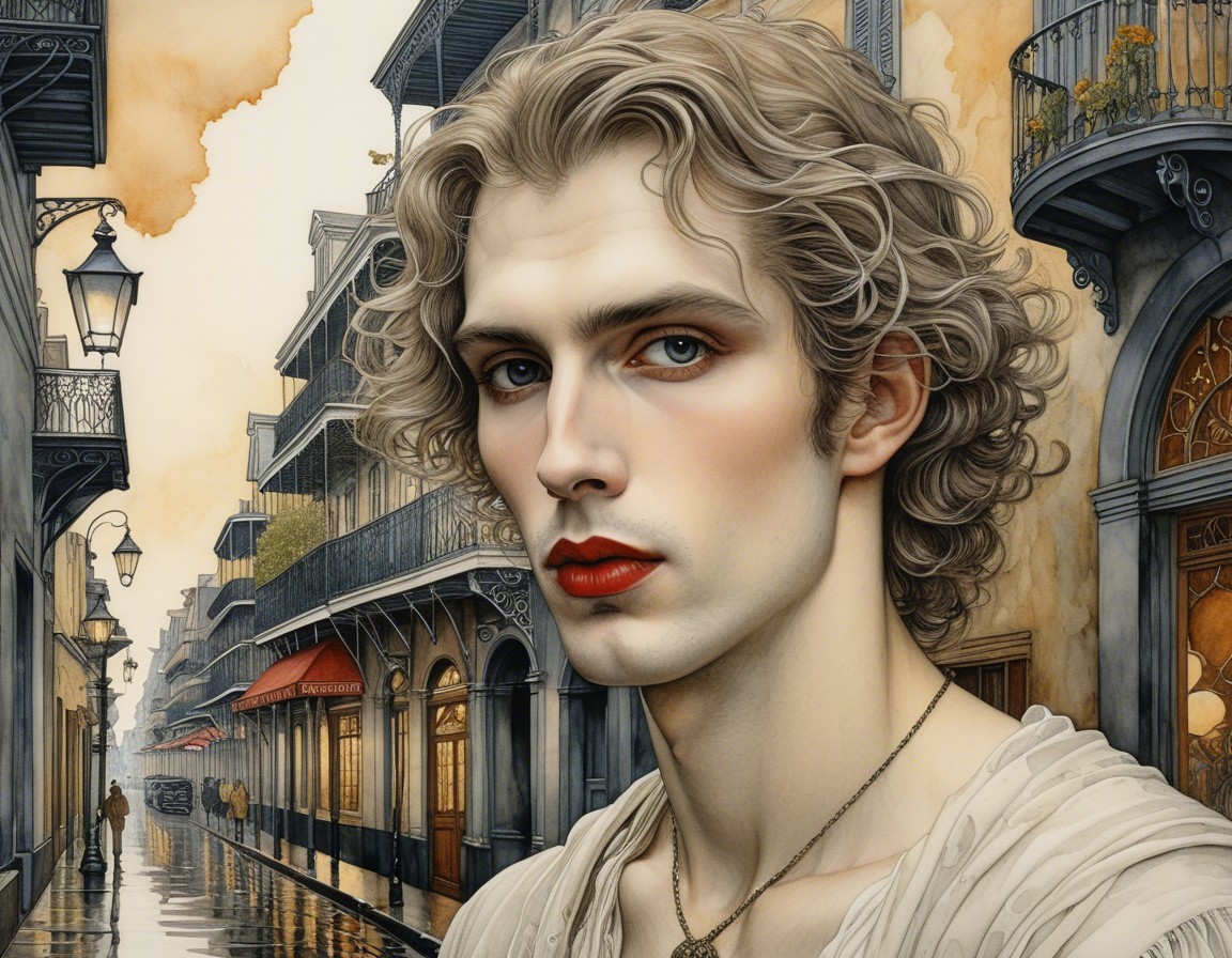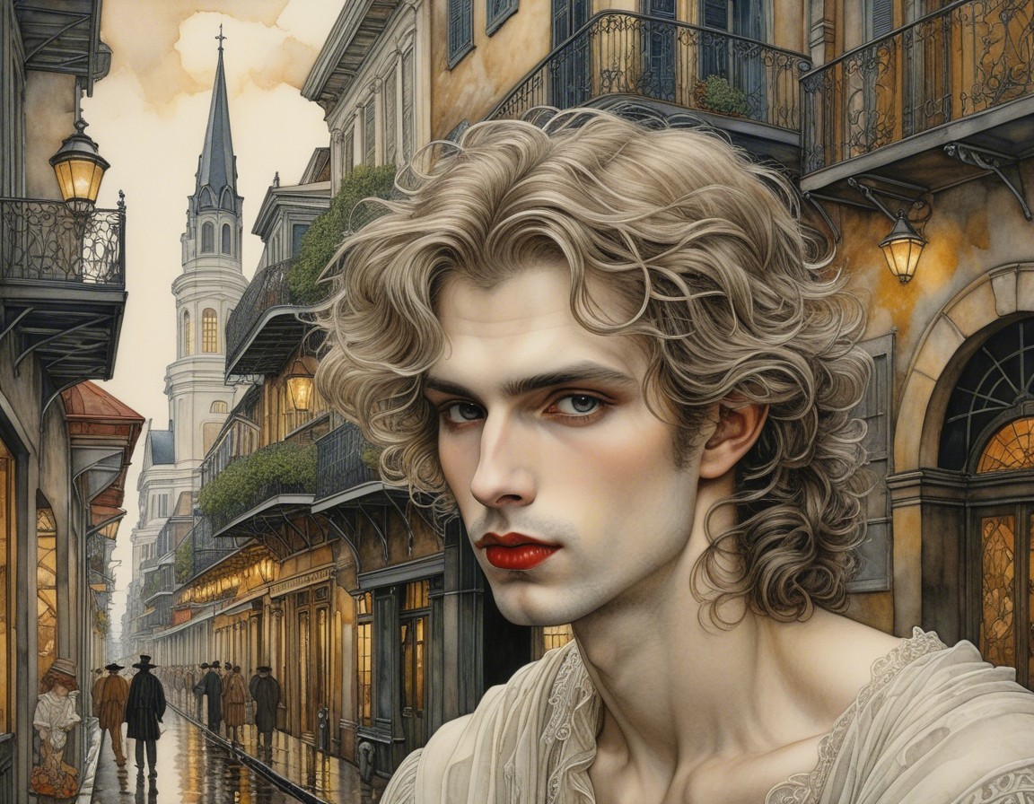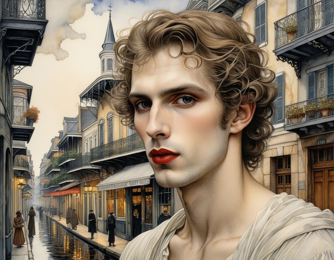 A portrait of a young man with curly hair and striking features stands in front of a picturesque street scene, showcasing historic buildings and a serene canal in a vibrant city.